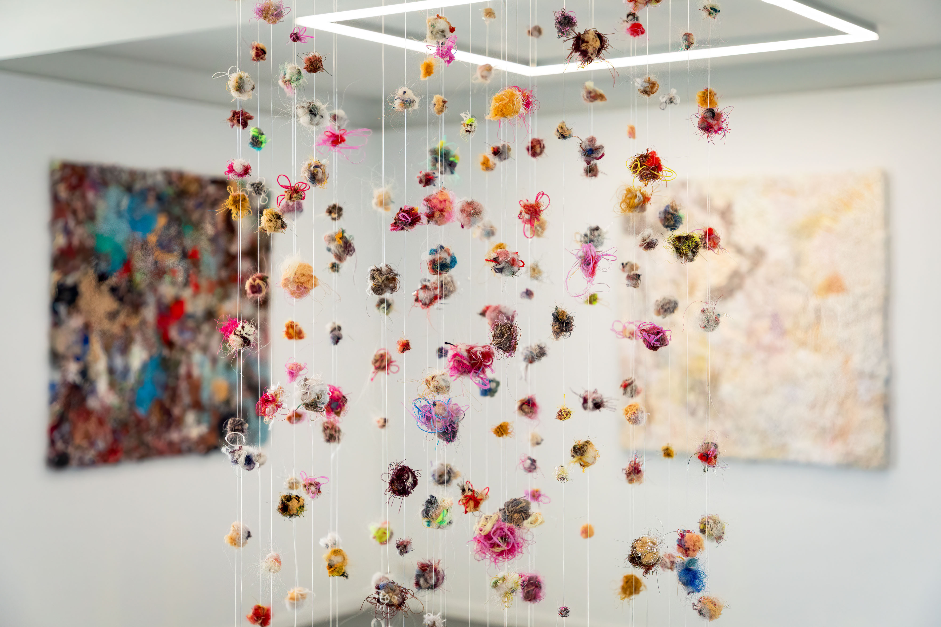 The process of making the Gathering Dust works has acted as a way of thinking through these ideas. The works have been created almost wholly from domestic waste – post consumer garments, yarn, wire, fibres, ribbon, packaging materials, cushion stuffing, doilies, tablecloths, fragments of 21st century household detritus. Those materials are de-constructed and re-interpreted using techniques grounded in my textile practice – such as coiling, spinning, felting, shredding, carding, extruding, tufting, embroidering and knitting.